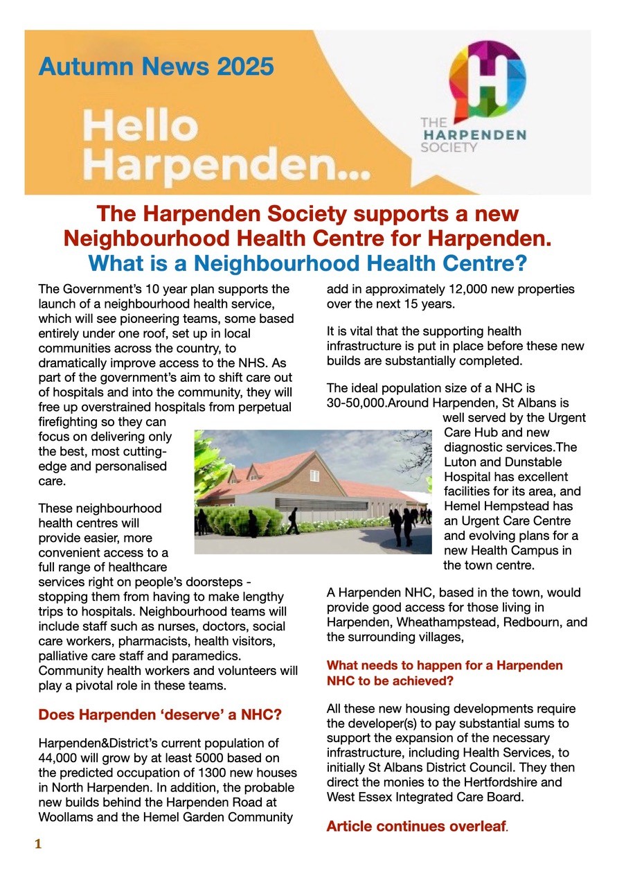 The Harpenden Society is a charitable organisation that was formed in 1930 and campaigns for things that matter to the people of Harpenden