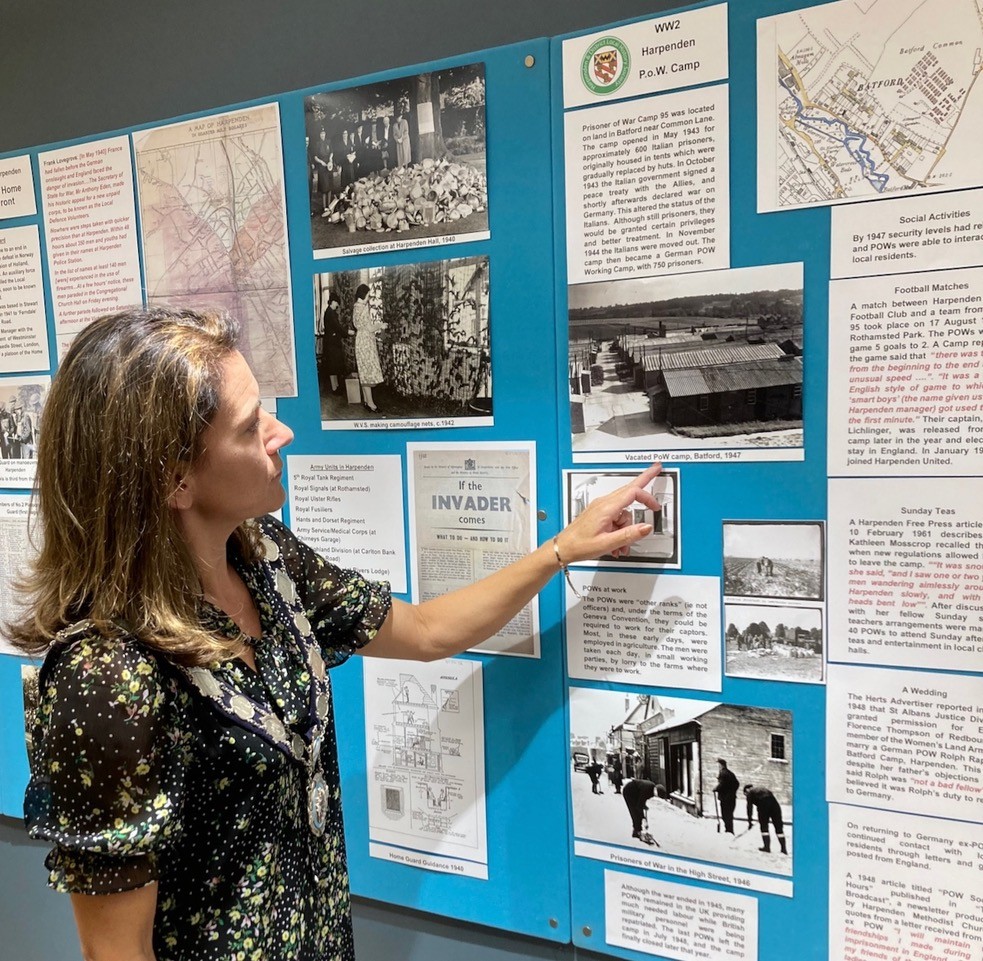 Town Mayor Cllr Beth Fisher examining the displays of documents about the WW2 POW camp in Batford.