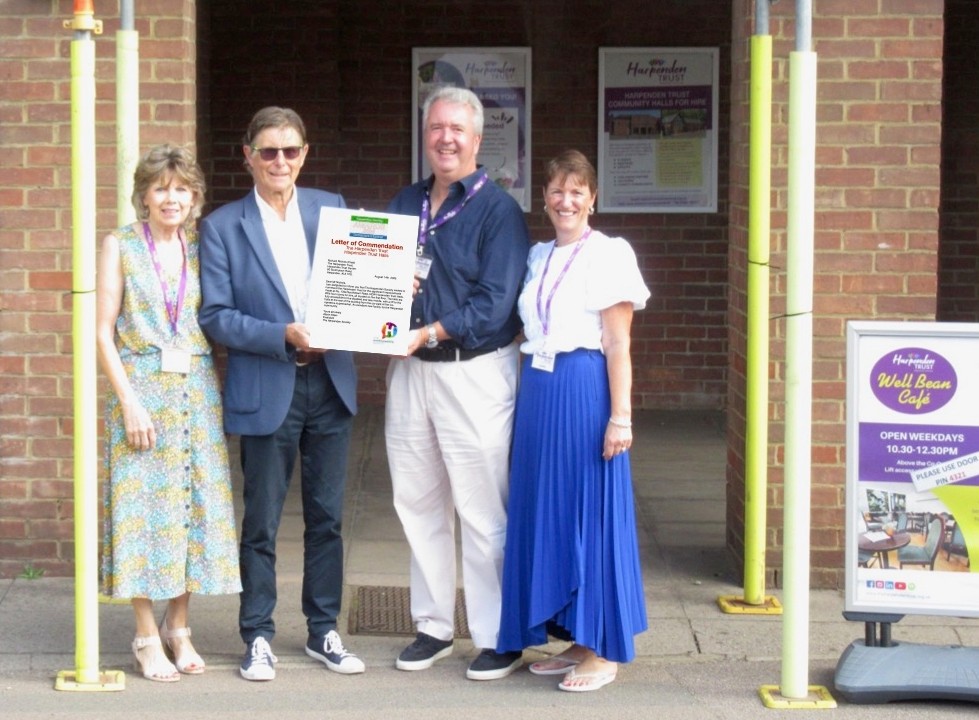 Harpenden Society Awards Secretary Ron Taylor presents the Society's 2024 Letter of Commendation to Harpenden Trust Chairman Richard Nichols, accompanied by the Trust's People Director Pat Ring (left) and its company secretary Amber Nicholls