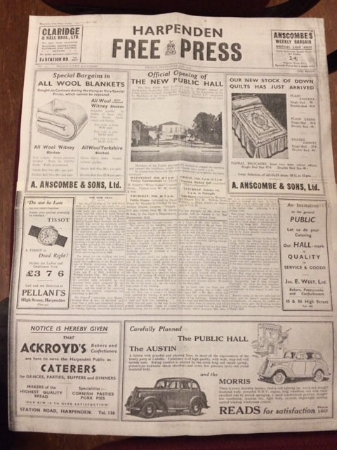 How the Public Halls came into being eighty years ago was the subject of a presentation at the Harpenden Society's well-attended December meeting. The guest speakers were Rosemary and Gavin Ross from the town's thriving local history society, whose extensive archives contain a wealth of information on the prolonged local civic machinations leading up to the Halls' opening in 1938.