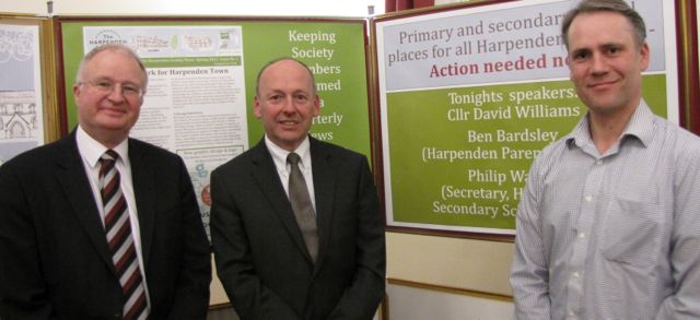 This was revealed at a public meeting on 'Schools; Locations and Places' organised by the Harpenden Society on Thursday 26 February. A panel of three speakers, Ben Bardsley, chairman of the Harpenden Parents Group, County Councillor David Williams and Philip Waters, Secretary of the Harpenden Secondary Schools Trust (HSST) which has been responsible for formulating the application. The Trust is comprised of representatives of the three existing secondary schools, Rothamsted Research and the University of Hertfordshire.