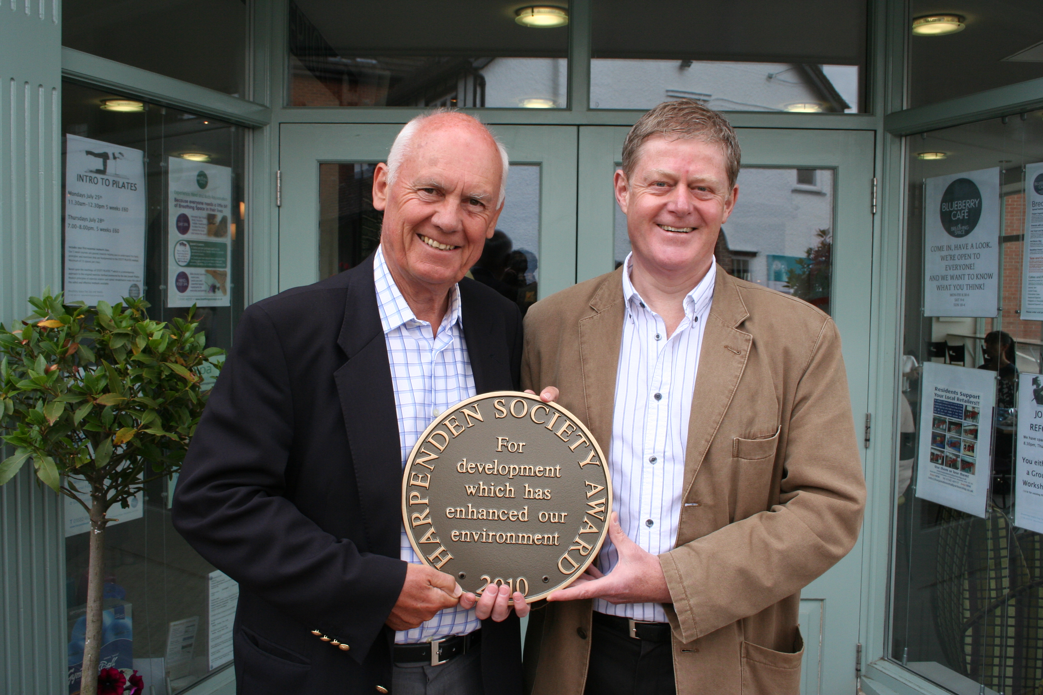 The Harpenden Society presented the annual “Harpenden Society Award” to the new development in Thompson's Close in Harpenden comprising Breathing Space fitness club and Blueberry Café. Chris Marsden presented the award on Wednesday 13th July 2011 to Keith Lunn the owner of the businesses; Chris explained that the awards are presented for developments which enhance the environment.
