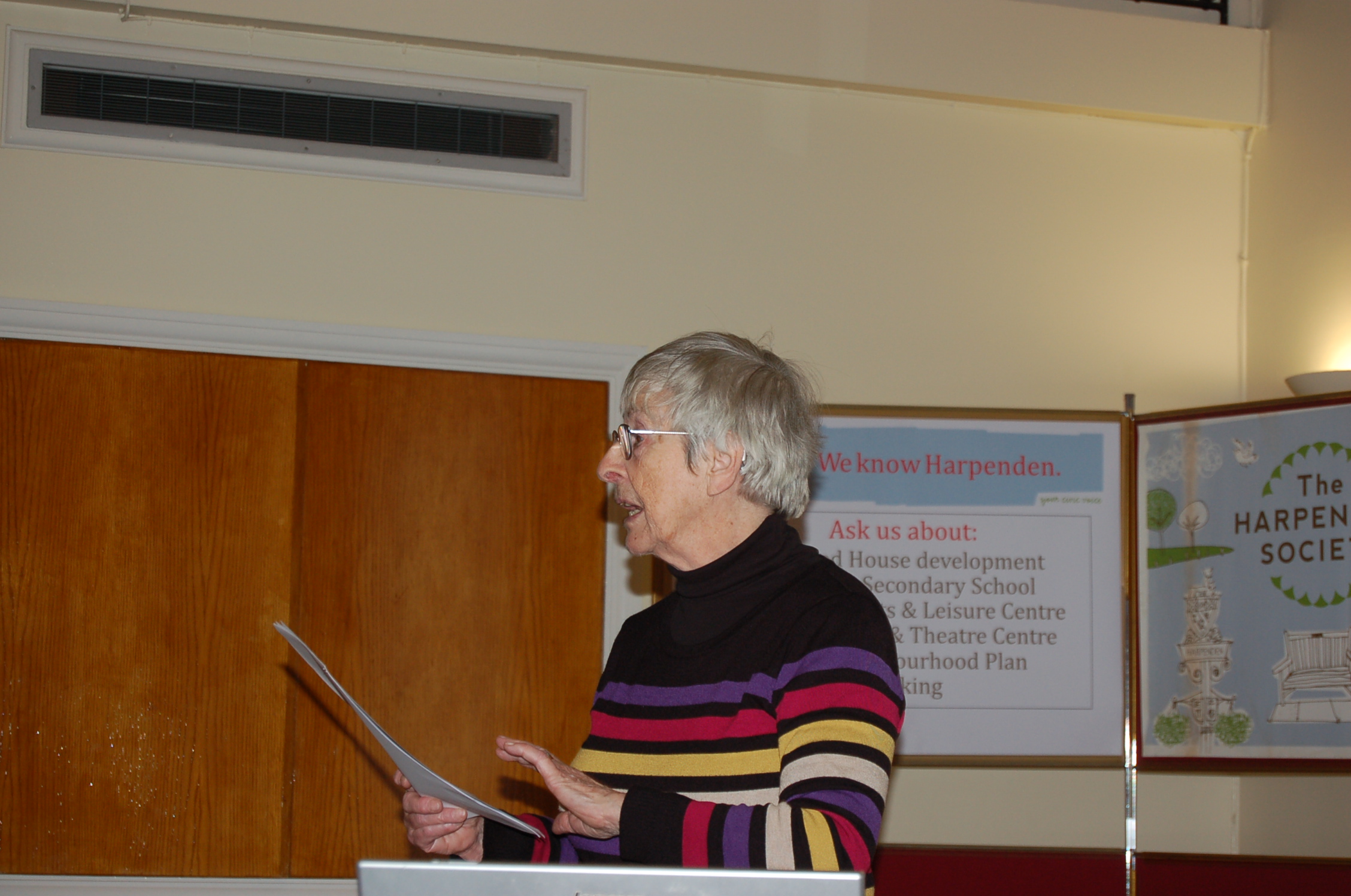 Rosemary began by reminding her Park Hall audience that they were sitting in what was previously the village's Public Hall. As early as 1919, on the occasion of the war memorial dedication on Church Green, ideas for an all-new facility were put forward. It was among a package of tentative proposals which envisaged, in a comprehensive single development, ‘a hall suitable for public meetings and entertainments of every kind, including dancing; smaller meeting rooms for refreshments, games eg billiards; offices for Harpenden Urban District Council (HUDC); a library; and a creche'.